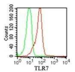 - Flow cytometric analysis of TLR7 in human monocytes using 2 µg of TLR7 monoclonal antibody (Product # MA5-16247) (red) and 2 µg of mouse IgG1 isotype control antibody (green). anti-mouse IgG PE conjugated secondary antibody.