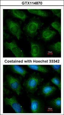 - Immunofluorescence analysis of methanol-fixed HeLa, using UBE2L3(GTX114870) antibody at 1:200 dilution.