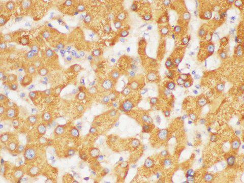 - Immunohistochemistry of paraffin-embedded Human liver using FGB Polycloanl Antibody at dilution of 1:200.