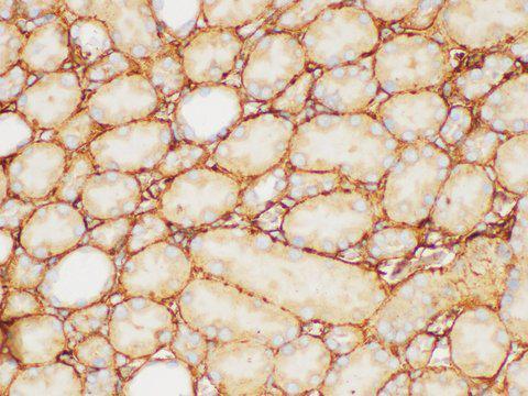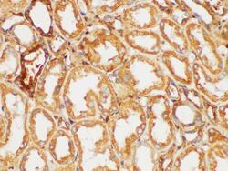 - Immunohistochemistry of paraffin-embedded Human kidney using FGB Polycloanl Antibody at dilution of 1:200.