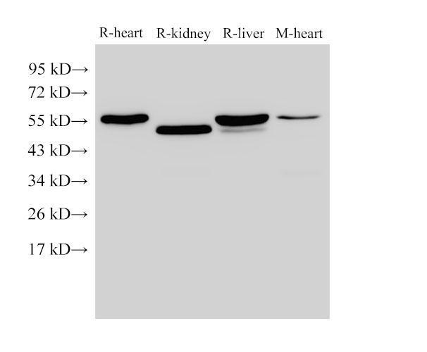 - Western Blot analysis of Rat heart, Rat kidney, Rat liver and Mouse heart using FGB Polyclonal Antibody at dilution of 1:4000.