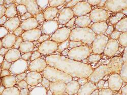 - Immunohistochemistry of paraffin-embedded Rat kidney using FGB Polycloanl Antibody at dilution of 1:200.