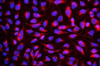 - Immunofluorescent staining of FFPE human U-2 OS cells with DYRK1A antibody (red) and DAPI nuclear stain (blue). HIER: steam section in pH6 citrate buffer for 20 min.