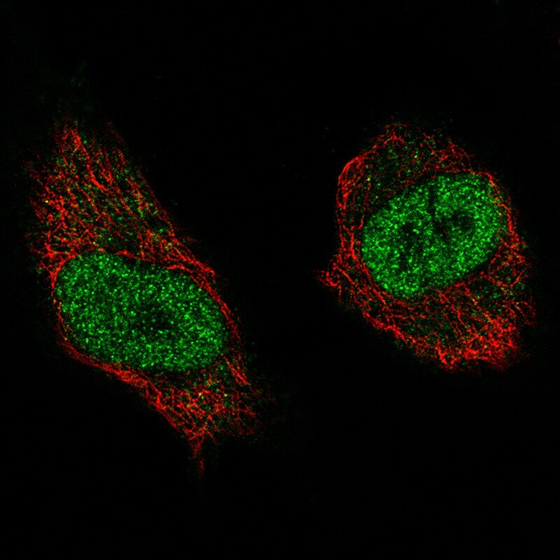 - Immunofluorecent analysis of NSD2 in U-251 cells using NSD2 Monoclonal Antibody (CL1063) (Product # MA5-24621). Staining shows specific staining in the nucleoplasm in green. Microtubule- and nuclear probes are visualized in red and blue, respectively (where available).