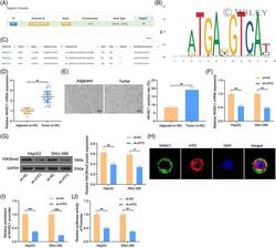- 3 FIGURE ATF2 silencing reduces expression of WHSC1 in HCC cells. (A) data in the hTFtarget database suggests WHSC1 as a downstream target of ATF2; (B) conservative binding site of ATF2; (C) putative binding site between WHSC1 and ATF2; (D,E) mRNA (D) and protein (E) expression of WHSC1in clinically collected HCC tumor tissues and the paired normal tissues ( n = 50) examined by RT-qPCR and IHC staining (paired t test); (F) mRNA expression of WHSC1 in HepG2 and SNU-398 cells after ATF2 silencing examined by RT-qPCR (two-way ANOVA); (G) protein level of H3K36me2 in HepG2 and SNU-398 cells after ATF2 silencing determined by western blot analysis (two-way ANOVA); (H), distribution of WHSC1 and H3K36me2 in HepG2 cells examined by fluorescence co-localization assay; (I), abundance of WHSC1 promoter fragments enriched by anti-ATF2 determined by the ChIP-qPCR assay (two-way ANOVA); (J), binding relationship between WHSC1 promoter and ATF2 validated by a dual-luciferase reporter gene assay (two-way ANOVA). Data are expressed as the mean +- SD. Repetition = 3. * p < 0.05; ** p < 0.01; *** p < 0.001