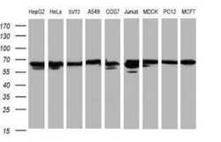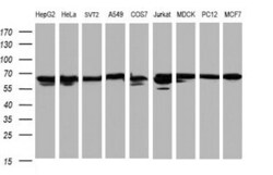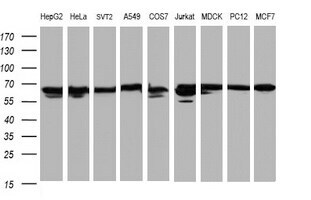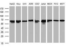 - Western blot analysis of extracts (35 µg) from 9 different cell lines by using anti-Hsp60 (HSPD1) monoclonal antibody (HepG2: human; HeLa: human; SVT2: mouse; A549: human; COS7: monkey; Jurkat: human; MDCK: canine; PC12: rat; MCF7: human).