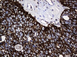 - Immunohistochemical staining of paraffin-embedded Adenocarcinoma of Human colon tissue using anti-Hsp60 (HSPD1) mouse monoclonal antibody. (Heat-induced epitope retrieval by 10mM citric buffer, pH6.0, 120°C for 3min, TA800772)