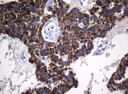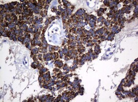 - Immunohistochemical staining of paraffin-embedded Carcinoma of Human thyroid tissue using anti-Hsp60 (HSPD1) mouse monoclonal antibody. (Heat-induced epitope retrieval by 10mM citric buffer, pH6.0, 120°C for 3min, TA800772)