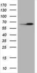 - HEK293T cells were transfected with the pCMV6-ENTRY control (Left lane) or pCMV6-ENTRY Hsp60 (HSPD1) (RC201281, Right lane) cDNA for 48 hrs and lysed. Equivalent amounts of cell lysates (5 µg per lane) were separated by SDS-PAGE and immunoblotted with anti-Hsp60 (HSPD1). Positive lysates LY404564 (100 µg) and LC404564 (20 µg) can be purchased separately from OriGene.