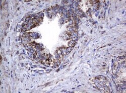 - Immunohistochemical staining of paraffin-embedded human prostate tissue within the normal limits using anti-Hsp60 (HSPD1) mouse monoclonal antibody. (Heat-induced epitope retrieval by 10mM citric buffer, pH6.0, 120°C for 3min, TA800772)
