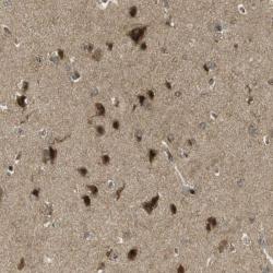- Immunohistochemical staining of human cerebral cortex shows strong cytoplasmic and nuclear positivity in neuronal cells.