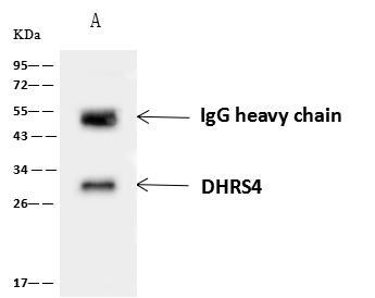 - DHRS4 was immunoprecipitated using: Lane A: 0.5 mg A549 Whole Cell Lysate. 4 uL anti-DHRS4 rabbit polyclonal antibody and 60 ug of Immunomagnetic beads Protein A/G. Primary antibody: Anti-DHRS4 rabbit polyclonal antibody, at 1:100 dilution. Secondary antibody: Goat Anti-Rabbit IgG (H+L)/HRP at 1/10000 dilution. Developed using the ECL technique. Performed under reducing conditions. Predicted band size: 30 kDa. Observed band size: 30 kDa.