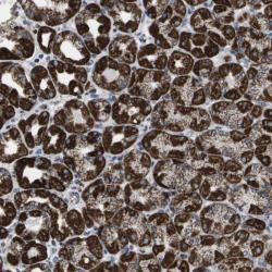 - Immunohistochemical staining of human stomach shows strong positivity in granular pattern in glandular cells.