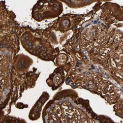 - Immunohistochemical staining of human placenta shows strong cytoplasmic positivity in trophoblastic cells.