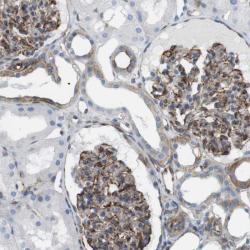 - Immunohistochemical staining of human kidney shows distinct cytoplasmic positivity in cells in glomeruli.
