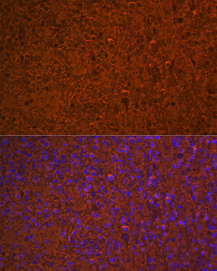 - Immunofluorescence analysis of mouse spleen using Hemoglobin subunit alpha (HBA1) (HBA1) rabbit monoclonal antibody (STJ11102472) at dilution of 1:100 (40x lens). Blue: DAPI for nuclear staining.