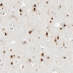 - Immunohistochemical staining of human cerebral cortex shows strong nuclear positivity in neuronal cells.