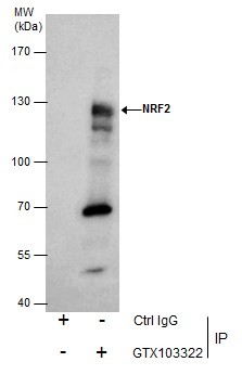 - Immunoprecipitation of NRF2 protein from HepG2 whole cell extracts using 5 ?g of NRF2 antibody [N2C2], Internal (GTX103322).Western blot analysis was performed using NRF2 antibody [N2C2], Internal (GTX103322).EasyBlot anti-Rabbit IgG (GTX221666-01) was used as a secondary reagent.
