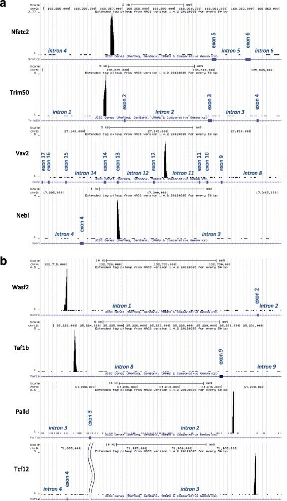 - Fig. 3 Variation of distances from WASp ChIP-Seq gene peaks to nearest exon(s). Selected examples of genes with ( a ) shorter distance range (0.5-5 kb) and ( b ) longer distance range (5-50 kb) between WASp ChIP-seq gene peak position and nearest exon. Additional file 1 : Figure S4