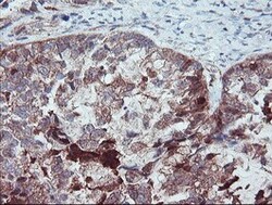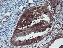 - Immunohistochemical staining of paraffin-embedded Adenocarcinoma of Human endometrium tissue using anti-SERPINB1 mouse monoclonal antibody. (Heat-induced epitope retrieval by 10mM citric buffer, pH6.0, 100°C for 10min, TA800078)