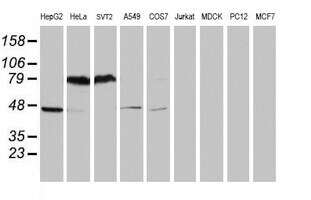 - Western blot analysis of extracts (35 µg) from 9 different cell lines by usin g anti-SERPINB1 monoclonal antibody (HepG2: human; HeLa: human; SVT2: mouse; A549: human; COS7: monkey; Jurkat: human; MDCK: canine; PC12: rat; MCF7: human).