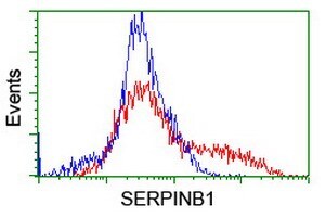 - HEK293T cells transfected with either RC202138 overexpress plasmid (Red) or empty vector control plasmid (Blue) were immunostained by anti-SERPINB1 antibody (TA800078), and then analyzed by flow cytometry.