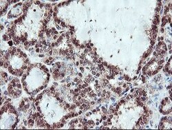 - Immunohistochemical staining of paraffin-embedded Carcinoma of Human thyroid tissue using anti-SERPINB1 mouse monoclonal antibody. (Heat-induced epitope retrieval by 10mM citric buffer, pH6.0, 100°C for 10min, TA800078)