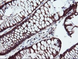 - Immunohistochemical staining of paraffin-embedded human colon tissue within the normal limits using anti-SERPINB1 mouse monoclonal antibody. (Heat-induced epitope retrieval by 10mM citric buffer, pH6.0, 100°C for 10min, TA800078)
