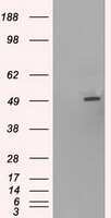- HEK293T cells were transfected with the pCMV6-ENTRY control (Left lane) or pCMV6-ENTRY HNF6 (RC218219, Right lane) cDNA for 48 hrs and lysed. Equivalent amounts of cell lysates (5 µg per lane) were separated by SDS-PAGE and immunoblotted with anti-HNF6. Positive lysates LY401429 (100 µg) and LC401429 (20 µg) can be purchased separately from OriGene.