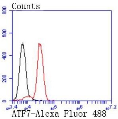 - Flow Cytometry: ATF7 Antibody (JJ2-072) [NBP2-67857] - Analysis of Jurkat cells with ATF7 antibody at 1/50 dilution (red) compared with an unlabelled control (cells without incubation with primary antibody; black). Alexa Fluor 488-conjugated goat anti rabbit IgG was used as the secondary antibody