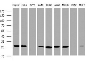 - Western blot analysis of extracts (35 µg) from 9 different cell lines by usin g anti-NQO2 monoclonal antibody (HepG2: human; HeLa: human; SVT2: mouse; A549: human; COS7: monkey; Jurkat: human; MDCK: canine; PC12: rat; MCF7: human).