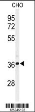 - Western blot analysis of Sirt3 Antibody (C-term) (Cat. #AP6242b) in CHO cell line lysates (35ug/lane).Sirt3 (arrow) was detected using the purified Pab.