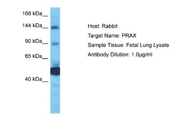 - Western Blot: Periaxin Antibody [NBP2-83382] - Host: Rabbit. Target Name: PRAX. Sample Type: Fetal Lung lysates. Antibody Dilution: 1.0ug/ml