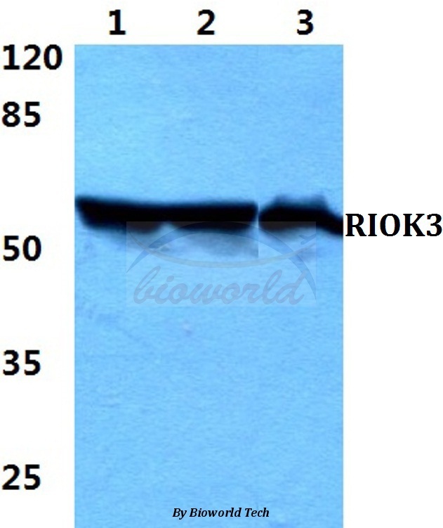 - Western blot (WB) analysis of RIOK3 pAb at 1:500 dilutionLane1:Hela cell lysateLane2:Raw264.7 cell lysateLane3:H9C2 cell lysate