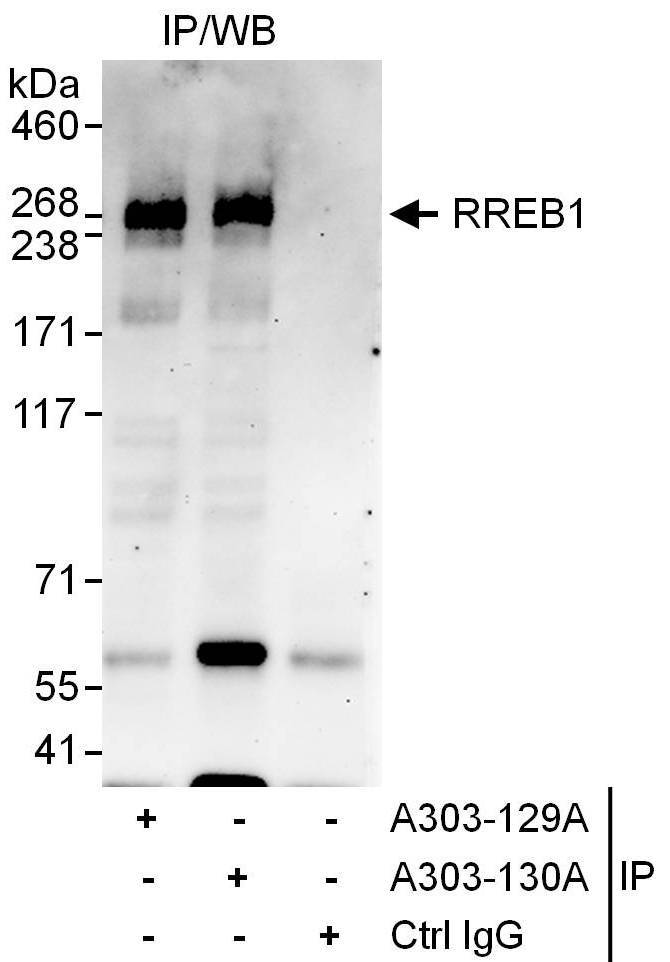 - Detection of human RREB1 by western blot of immunoprecipitates. Samples: Whole cell lysate (1 mg for IP, 20% of IP loaded) from HeLa cells. Antibodies: Affinity purified rabbit anti-RREB1 antibody A303-129A used for IP at 6 µg/mg lysate. RREB1 was also immunoprecipitated by rabbit anti-RREB1 antibody A303-130A, which recognizes a downstream epitope. For blotting immunoprecipitated RREB1, A303-130A was used at 1 µg/ml. Detection: Chemiluminescence with an exposure time of 30 seconds.