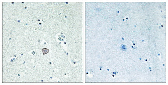 - Immunohistochemistry analysis of paraffin-embedded human brain tissue using ADORA2A antibody. The picture on the right is treated with the synthesized peptide.