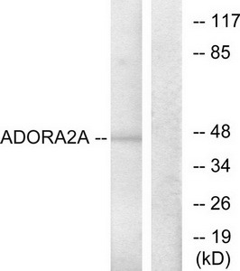 - Western blot analysis of extracts from HepG2 cells, using ADORA2A antibody. The lane on the right is treated with the synthesized peptide.