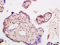 - Formalin-fixed and paraffin embedded human placenta labeled with Rabbit Anti CDKN1C/p57 Kip2 Polyclonal Antibody, Unconjugated (bs-0538R) at 1:200 followed by conjugation to the secondary antibody and DAB staining.