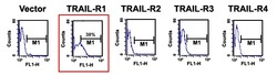 - Receptor specifitiy of the FITC-conjugated MAb HS101 for TRAIL-R1 (Prod. No. ALX-804-297F). Method: CV1/EBNA cells were transfected either with the empty expression vector pCDNA3 (vector control) or pCDNA3 encoding TRAIL-R1 to TRAIL-R4. Two days after transfection 1x10E6 cells were stained with FITC-conjugated MAb HS101 against TRAIL-R1. All primary antibodies were used at 5µg/ml. Transfection efficiency was about 50% in all individual transfections.