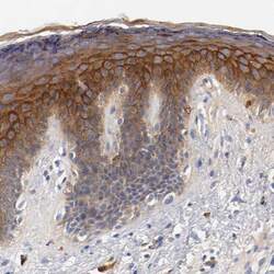 - Immunohistochemical analysis of FGFBP1 in human skin using FGFBP1 Polyclonal Antibody (Product # PA5-52075) shows strong membranous positivity in squamous epithelial cells.