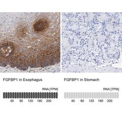- Immunohistochemical staining of FGFBP1 in human esophagus and stomach tissues using FGFBP1 Polyclonal Antibody (Product # PA5-52075). Corresponding FGFBP1 RNA-seq data are presented for the same tissues.