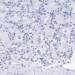 - Immunohistochemical staining of FGFBP1 in human stomach using FGFBP1 Polyclonal Antibody (Product # PA5-52075) shows low expression as expected.