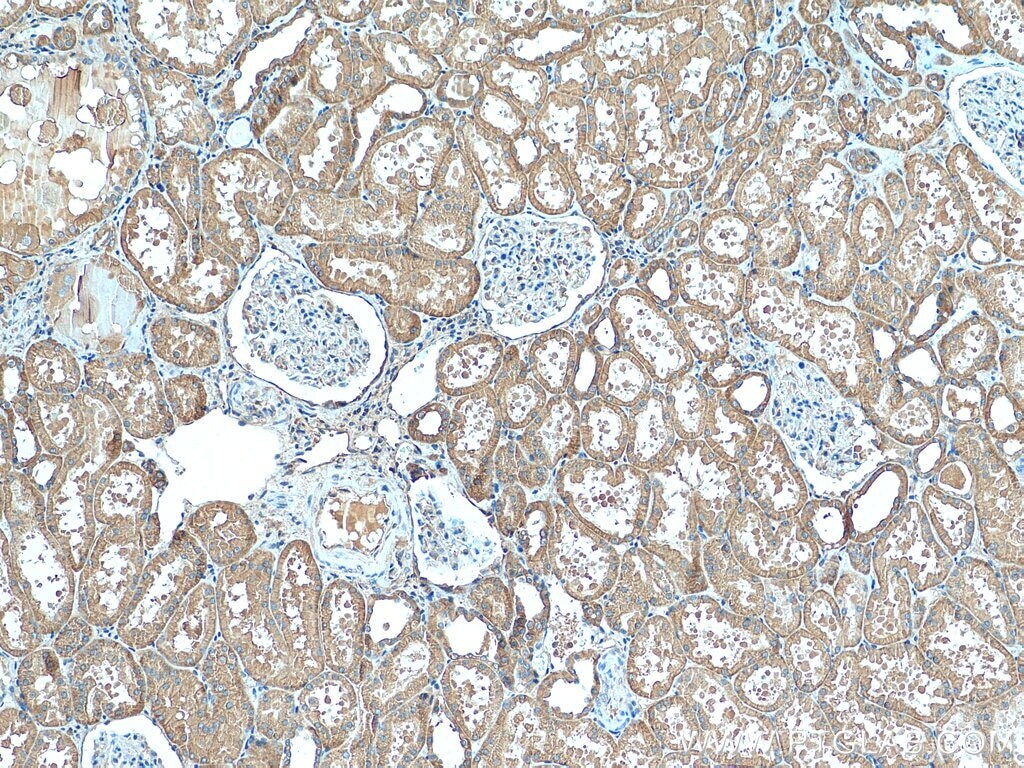 - Immunohistochemical analysis of paraffin-embedded human kidney tissue slide using (Product # 12521-1-AP) (TMOD3 antibody) at dilution of 1:200 (under 10x lens). Heat mediated antigen retrieval with Tris-EDTA buffer (pH 9.0).