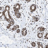 - Immunohistochemical staining of human breast with ZNF532 polyclonal antibody (Cat # PAB20809) shows strong cytoplasmic positivity in glandular cells at 1:50-1:200 dilution.
