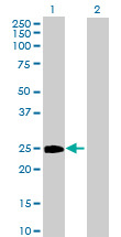 - Western Blot analysis of GGTLC1 expression in transfected 293T cell line (H00092086-T01) by GGTLC1 MaxPab polyclonal antibody.Lane 1: GGTLA4 transfected lysate(24.75 KDa).Lane 2: Non-transfected lysate.