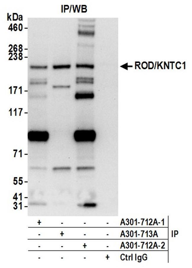 - Detection of human ROD/KNTC1 by western blot of immunoprecipitates. Samples: Whole cell lysate (1.0 mg per IP reaction; 20% of IP loaded) from HeLa cells prepared using NETN lysis buffer. Antibodies: Affinity purified rabbit anti-ROD/KNTC1 antibody A301-712A (lot A301-712A-2) used for IP at 3 µg per reaction. ROD/KNTC1 was also immunoprecipitated by a previous lot of this antibody (lot A301-712A-1) and rabbit anti-ROD/KNTC1 antibody A301-713A. For blotting immunoprecipitated ROD/KNTC1, A301-712A was used at 0.4 µg/ml. Detection: Chemiluminescence with an exposure time of 10 seconds.