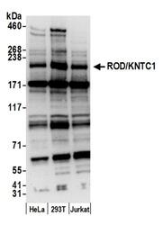 - Detection of human ROD/KNTC1 by western blot. Samples: Whole cell lysate (15 µg) from HeLa, 293T, and Jurkat cells prepared using NETN lysis buffer. Antibody: Affinity purified rabbit anti-ROD/KNTC1 antibody A301-712A (lot A301-712A-2) used for WB at 0.1 µg/ml. Detection: Chemiluminescence with an exposure time of 10 seconds.
