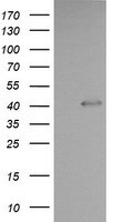 - HEK293T cells were transfected with the pCMV6-ENTRY control (Left lane) or pCMV6-ENTRY PARVA (Right lane) cDNA for 48 hrs and lysed. Equivalent amounts of cell lysates (5 ug per lane) were separated by SDS-PAGE and immunoblotted with anti-PARVA.