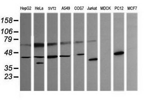 - Western blot of extracts (35 ug) from 9 different cell lines by using anti-PARVA monoclonal antibody (HepG2: human; HeLa: human; SVT2: mouse; A549: human; COS7: monkey; Jurkat: human; MDCK: canine; PC12: rat; MCF7: human).