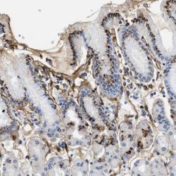 - Immunohistochemical staining of human stomach shows distinct basement membrane and cytoplasmic positivity in glandular cells.